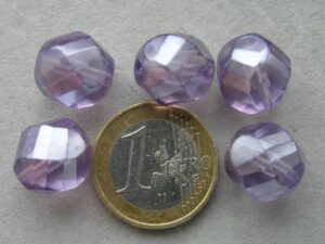 Grote lichtpaarse glaskralen, lamel facet, ze hebben een doorzichtige parelcoating.