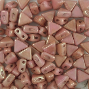 Een driehoekige vorm met 2 gaatjes door de lengte van de kraal waardoor er veel mogelijkheden zijn.