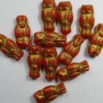 Opaque Red Gold Patina Owl shaped Glass Beads made in Czech Rebublic, the hole is in the lenght of the bead.